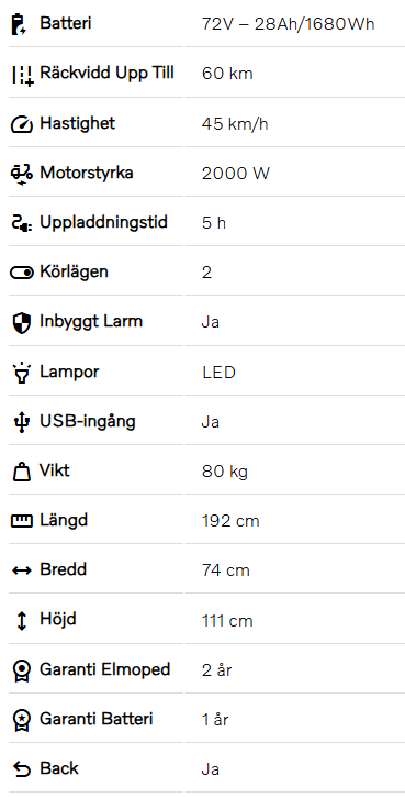 I ditt köp av elmoped ingår ett batteri på 28 Ah från Samsung med en räckvidd på ca 60km blandad normal stadskörning. Det finns även plats för extrabatteri under sadeln som köps separat.